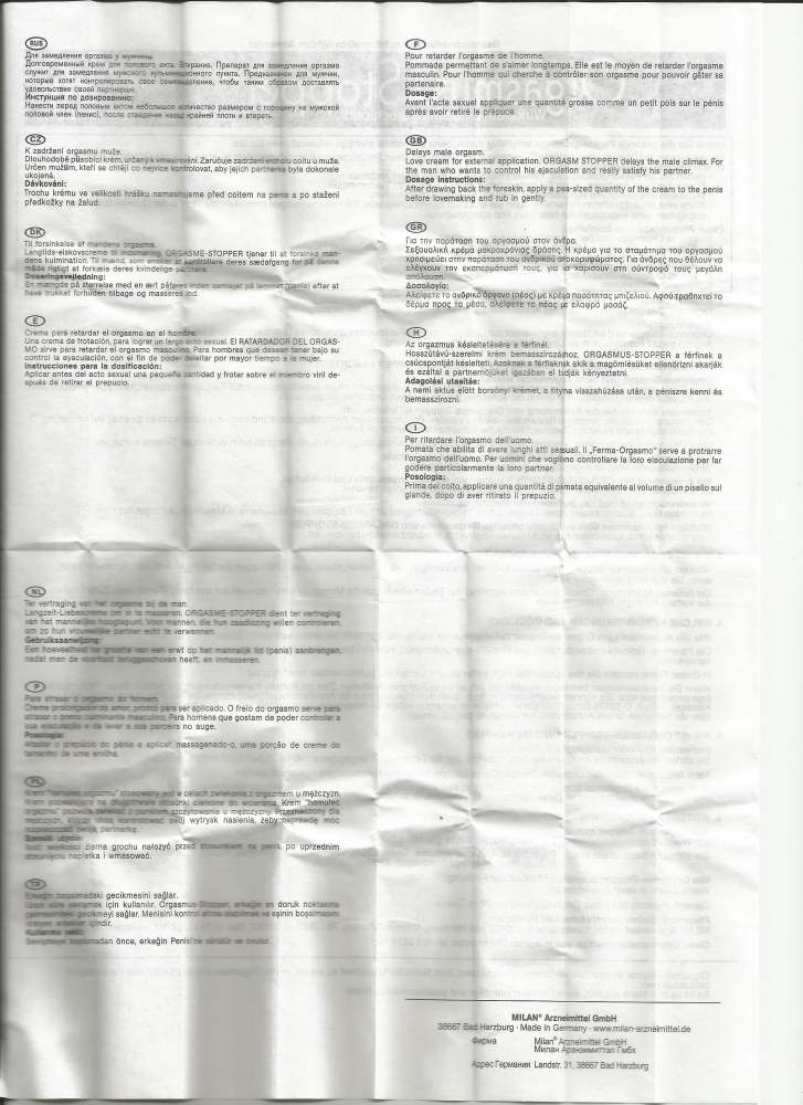 Orgasmus Stopper – это эффективный немецкий препарат от известной компании MILAN. Относится к пролонгаторам полового акта. Это означает, что с помощью средства, нанесенного на половой член, можно успешно избавиться от наиболее распространенной проблемы мужчин во всем мире – раннего семяизвержения.